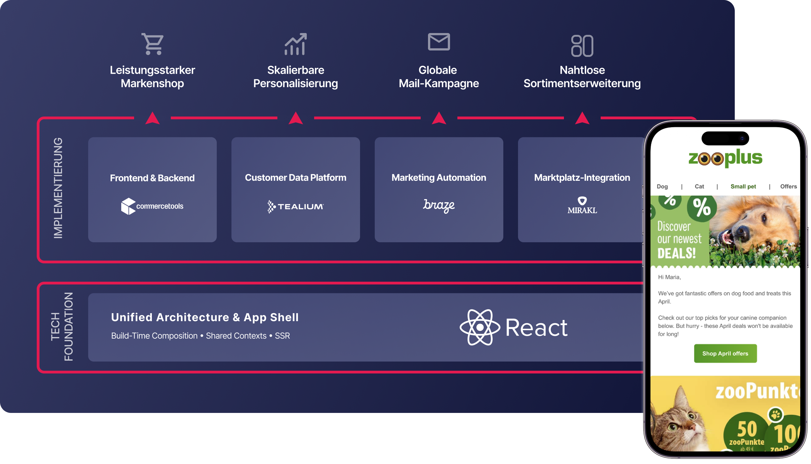 Als starker Partner heben wir die Systemlandschaft von zooplus auf das nächste Level. Im Zentrum steht die End-to-End-Entwicklung einer neuen Markenshop-Plattform: Wir verantworten die komplette technische Umsetzung von Frontend bis Backend. Parallel integrieren wir unternehmensweite High-End-Technologien für Marketing Automation (Braze) und Datenmanagement (Tealium), um echte Personalisierung technisch zu erschließen. Gleichzeitig steuern wir die komplexe Architektur-Integration für das Marktplatz-Geschäft (Mirakl). Das Ergebnis ist eine robuste, skalierbare Plattform, die wir im laufenden Betrieb modernisieren.